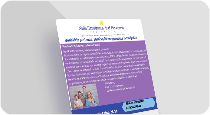 OTA MEIHIN YHTEYTTÄ POSTIOSOITE: STAR Foundation P.O. Box 115 Golden’s Bridge, New York sähköposti: [email protected] verkkosivusto: www.sallaresearch.org Uudet ja parannetut facebook: facebook.com/sallaresearch instagram: verkkosivut ja instagram.com/sallaresearch sosiaalisen median sisältö! linkedin: linkedin.com/company/salla-treatment-and-research-foundation Perheet – onko sähköpostiosoitteesi muuttunut? lähetä päivityksiä STAR- tietovastaavalle Agnes Jensenille osoitteeseen [email protected] varmistaaksesi, että saat STAR-julkaisuja ja uutisia ä ä ä ä ä t ä t t i t t i i t i i i K K K ! ! ä ! ä n ä i n i n s i s s www.canva.com - voittoa tavoittelemattoman järjestömme tukemiseen ilmaisen tilin kautta (käytetään tämän uutiskirjeen luomiseen) MARRASKUU 2023 S. 12