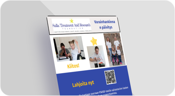 Varainhankinna n päivitys Kiitos! Lahjoita nyt Varainkeruulla tuetaan suoraan FSASD-tautia sairastavien lasten hoitojen tutkimuksen nopeuttamista. Jokainen varainkeruu (iso ja pieni) auttaa! https://sallaresearch.networkforgood.com/projects/97052-salla- research (tai skannaa QR-koodi yllä) Varainhankintaneuvoja tai suunnattua lahjoitusta varten ota yhteyttä Jessica Foglioon ([email protected]) tai STAR- rahastonhoitajaan Ken Kleiniin ([email protected]) MARRASKUU 2023 S. 9
