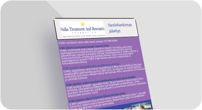 Varainhankinnan päivitys STARin keräämät varat vaikuttavat suoraan TUTKIMUKSIIN: STAR-lahjoitus Greenwood Genetic Centeriin (GGC): STARin lahjoittamat varat antavat konsortion jäsenille mahdollisuuden mitata siaalihappoarvot (erikoismenetelmä) samalla määritysmenetelmällä samassa laboratoriossa, vapaasti ja nopeasti GGC:ssä. Siaalihappoarvot on mitattu potilaan ja hiiren solulinjoista, virtsasta ja kudoksista (mukaan lukien hiiren aivot). Nämä siaalihappoarvot auttavat FSASD-diagnoosissa, sairauden mekanismissa ja hoitovastetutkimuksissa. STAR Lahjoitus harjoittelijoiden rahoittamiseen NIH:ssa STARin lahjoittamat varat tukivat harjoittelijoille Mary Hackbarthille ja Petcharat Leoyklangille) palkkatukea vuosina 2020–2023, samalla kun he tekivät FSASD:lle omistettua tutkimusta. Heidän työnsä tuki suoraan NIH:n saavutuksia hiirimalleissa ja solumäärityksissä. STAR-lahjoitus uuden apurahan rahoittamiseen Université de Parisille: STAR hyväksyi äskettäin apurahan tohtori Bruno Gasnierin laboratoriolle hänen työhönsä, joka keskittyy lääkkeiden tunnistamiseen ja testaukseen. Tämän apurahan rahoittaminen mahdollisti Kaiserin ja Ammannin perheiden anteliaiden lahjoitusten ansiosta. Kiitos! STAR-lahjoitus Albert Einsteinin lääketieteellinen koulu STARin lahjoittamat varat tukivat tohtori Kostantin Dobrenisia Rose F. Kennedy Centerissä. Rahoituksella tuetaan tohtori Dobreniksen työtä hiiripesäkkeiden kanssa mahdollisten hoitojen etsimisessä. MARRASKUU 2023 S. 8