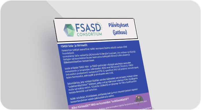 Päivitykset (jatkuu) FSASD Solu- ja hiirimallit Konsortion tutkijat saavuttivat kaikki seuraavat (toimia rahoitti osittain STAR Foundation): suomalaista Salla-varianttia jäljittelevän hiirimallin luominen, jota voidaan nyt käyttää tiettyjen sairausoireiden (kuten hermoston kehityshäiriöiden) tutkimukseen ja lääkekandidaattien testaamiseen. luoda erilaisia FSASD-hiiri- ja FSASD-potilaiden viljeltyjä solulinjoja sairauden mekanismin ja terapioiden tutkimiseksi. Näitä ovat fibroblastit (ihosolut), FSASD- indusoidut pluripotentit kantasolut (iPSC:t), spesifiset iPSC:istä johdetut aivosolutyypit, kuten hermosolut, astrosyytit ja aivokuoren neuronit. Solumääritys, jota voidaan käyttää useiden lääkkeiden seulomiseen, mukaan lukien "uudelleenkäyttöiset" lääkkeet, jotka ovat jo kliinisissä kokeissa/FDA:n hyväksymiä muita sairauksia varten. Tällaisilla lääkkeillä on lyhyempi tie FDA:n hyväksyntään testata ihmisillä uusi tarkoitus. Kaikki solulinjat, hiirinäytteet, potilasnäytteet ja muut resurssit jaetaan vapaasti konsortioryhmien kesken jatkotutkimusta varten. Miksi hiirimallit?? Mitä on huumeiden "uudelleenkäyttö"? Konsortion tutkija tohtori Steven Walkley selitti hiirimallien käyttöä Tarrytownissa lokakuun kokouksen vanhempainistunnossa. Lupaavien lääkeehdokkaiden löytämiseksi ne on ensin testattava soluissa kuin eläinmallissa (yksinkertaiset järjestelmät, kuten seeprakala tai hiiret). Näiden mallien luominen vie aikaa! NIH on luonut hiirimallin, jossa on sama suomalainen Salla-variantti, joka löytyy ihmisistä. Hiiret syntyvät ja näyttävät normaaleilta, ja sitten ne kehittävät taudin hitaasti (ne voivat elää useita kuukausia), joten niille voidaan testata erilaisia lääkehoitoja. Jos lääke on lupaava ja jos lääkettä ei ole vielä testattu ihmisillä, ne pitäisi ensin testata suuremmilla eläimillä. Jos lääkettä ON aiemmin testattu ihmisellä (mutta eri taudista tai syystä), se voidaan "uudelleentarkoittaa" ja sitä voidaan mahdollisesti käyttää uuden sairauden, kuten FSASD:n, hoitoon. "Uudelleentarkoitettu lääke", koska sen on jo osoitettu olevan turvallinen ihmiselle, olisi teoriassa todellisten potilaiden saatavilla nopeammin. Konsortion suunnitelma (jos rahoitusta on saatavilla) on nopeuttaa prosessia antamalla useita laboratorioita testata lääkkeitä samanaikaisesti. Tämä on työvoimavaltaista työtä ja vaatii investointeja. MARRASKUU 2023 S. 6