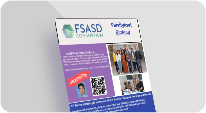 Päivitykset (jatkuu) CRISPR-teknologiajulkaisu Tohtori Ray Wang (Children’s Hospital of Orange County Specialists, Orange, CA) johti ryhmää, joka julkaisi elokuussa 2023 "Perusmuokkaus korjaa yleisen Sallan taudin SLC17A5 c.115C>T variantin". Katso linkki tai skannaa QR-koodi alla: https://www.ncbi.nlm.nih.gov/pmc/articles/PMC10506058/ Tri Steven Walkley jää eläkkeelle Albert Einstein College of Medicine -yliopistosta Tarrytownin kokouksessa juhlimme tohtori Walkleyn eläkkeelle siirtymistä Einstein College of Medicine -yliopistosta. Olemme niin kiitollisia, että eläkkeelle jäämisestä huolimatta hän jatkaa STAR- ja FSASD-yhteisömme jäsenenä. Hyvä tohtori Walkley: Kiitos, että annoit meille toivoa ja tarkoitusta Benin kanssa tekemämme diagnoosin keskellä. Rose F. Kennedy Centerissä tekemäsi ponnistelujen ansiosta niin monet meidän kaltaiset perheet ovat motivoituneita tuomaan hoitoja harvinaisiin sairauksiin. Olet juurruttanut meihin horjumattoman uskon, että mikään sairaus ei ole liian harvinainen toteuttamiskelpoisten tutkimus- ja hoitovaihtoehtojen kannalta. Olimme ensimmäinen perhe, joka oli osa IDDRC-hankettasi, ja olemme varmoja, että tästä uskomattomasta ohjelmasta tulee ikuisesti loistava jalokivi Rose F. Kennedy Centerissä. Jessica ja Mike MARRASKUU 2023 S. 7