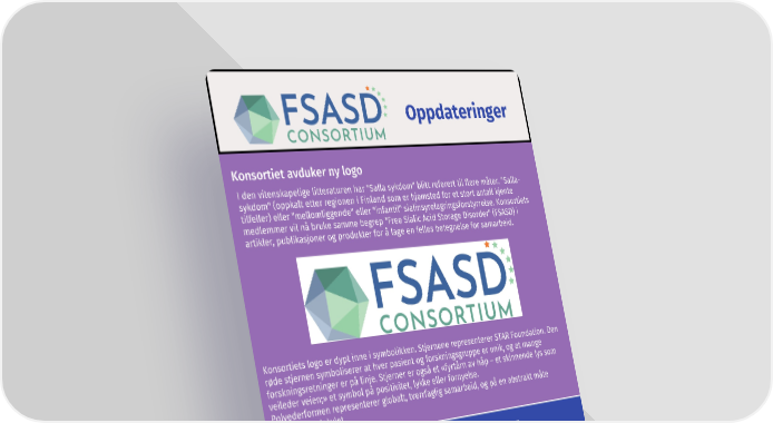 Oppdateringer Konsortiet avduker ny logo I den vitenskapelige litteraturen har "Salla sykdom" blitt referert til flere måter. "Salla- sykdom" (oppkalt etter regionen i Finland som er hjemsted for et stort antall kjente tilfeller) eller "mellomliggende" eller "infantil" sialinsyrelagringsforstyrrelse. Konsortiets medlemmer vil nå bruke samme begrep "Free Sialic Acid Storage Disorder" (FSASD) i artikler, publikasjoner og produkter for å lage en felles betegnelse for samarbeid. Konsortiets logo er dypt inne i symbolikken. Stjernene representerer STAR Foundation. Den røde stjernen symboliserer at hver pasient og forskningsgruppe er unik, og at mange forskningsretninger er på linje. Stjerner er også et «fyrtårn av håp – et skinnende lys som veileder veien;» et symbol på positivitet, lykke eller fornyelse. Polyederformen representerer globalt, tverrfaglig samarbeid, og på en abstrakt måte sialinsyremolekylet. Konsortiet vokser til 46 medlemmer I 2023 har FSASD-konsortiet vokst til 46 medlemmer fra 18 forskningssentre i fem land (USA, Finland, Frankrike, Storbritannia, Tyskland). Siden januar 2021 har de møttes nesten 12 ganger og to ganger i et hybridformat (personlig og virtuelt). Medlemmer signerer en taushetserklæring etter hvert møte som gir mulighet for gratis deling av kunnskap, data og ressurser. Ett og fem årsmål er vektlagt på hvert møte. Akselererer forskningen mot FSASD-terapi! NOVEMBER 2023, SIDE 4
