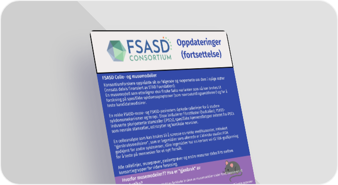 Oppdateringer (fortsettelse) FSASD Celle- og musemodeller Konsortiumforskere oppnådde alt av følgende og rapporterte om dem i nylige møter (innsats delvis finansiert av STAR Foundation): En musemodell som etterligner den finske Salla-varianten som nå kan brukes til forskning på spesifikke sykdomssymptomer (som nevroutviklingsproblemer) og for å teste kandidatmedisiner. En rekke FSASD-muse- og FSASD-pasienters dyrkede cellelinjer for å studere sykdomsmekanismer og terapi. Disse inkluderer fibroblaster (hudceller), FSASD- induserte pluripotente stamceller (iPSCs), spesifikke hjernecelletyper avledet fra iPSCs som nevrale stamceller, astrocytter og kortikale nevroner. En celleanalyse som kan brukes til å screene en rekke medikamenter, inkludert "gjenbruksmedisiner", som er legemidler som allerede er i kliniske studier/FDA godkjent for andre sykdommer, slike legemidler har en kortere vei til FDA-godkjenning for å teste på mennesker for et nytt formål. Alle cellelinjer, museprøver, pasientprøver og andre ressurser deles fritt mellom konsortiegrupper for videre forskning. Hvorfor musemodeller?? Hva er "gjenbruk" av narkotika? Konsortiumforsker Dr Steven Walkley forklarte bruken av musemodeller under foreldresesjonen til oktobermøtet i New York. For å finne lovende medikamentkandidater, må de først testes i celler, enn en dyremodell (enkle systemer som sebrafisk eller mus). Å lage disse modellene tar tid! NIH har laget en musemodell med den samme finske Salla-varianten som finnes hos mennesker. Musene blir født og ser normale ut, og utvikler deretter sykdommen sakte (de kan leve i mange måneder), så forskjellige medikamentelle behandlinger kan testes på dem. Hvis det er lovende, og hvis stoffet ennå ikke er testet på mennesker, må de testes på større dyr først. Hvis et medikament tidligere HAR blitt testet på et menneske (men av en annen sykdom eller grunn), kan det "gjenbrukes" og potensielt brukes til å behandle en ny sykdom, som FSASD. Et «medikament med gjenbruk», fordi det allerede har vist seg å være trygt for et menneske, ville i teorien være raskere tilgjengelig for ekte pasienter. Konsortiets plan (hvis finansiering er tilgjengelig) er å akselerere prosessen ved å la flere laboratorier teste medisiner samtidig. Dette er arbeidskrevende arbeid og krever investeringer. NOVEMBER 2023, S. 6