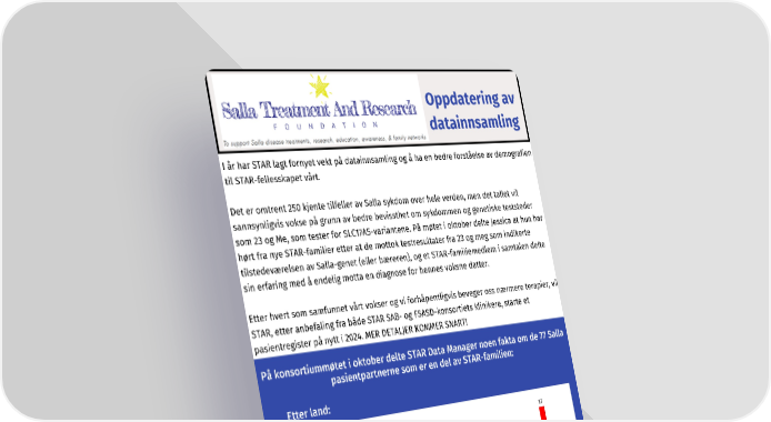 Oppdatering av datainnsamling I år har STAR lagt fornyet vekt på datainnsamling og å ha en bedre forståelse av demografien til STAR-fellesskapet vårt. Det er omtrent 250 kjente tilfeller av Salla sykdom over hele verden, men det tallet vil sannsynligvis vokse på grunn av bedre bevissthet om sykdommen og genetiske teststeder som 23 og Me, som tester for SLC17A5-variantene. På møtet i oktober delte Jessica at hun har hørt fra nye STAR-familier etter at de mottok testresultater fra 23 og meg som indikerte tilstedeværelsen av Salla-genet (eller bæreren), og et STAR-familiemedlem i samtalen delte sin erfaring med å endelig motta en diagnose for hennes voksne datter. Etter hvert som samfunnet vårt vokser og vi forhåpentligvis beveger oss nærmere terapier, vil STAR, etter anbefaling fra både STAR SAB- og FSASD-konsortiets klinikere, starte et pasientregister på nytt i 2024. MER DETALJER KOMMER SNART! På konsortiummøtet i oktober delte STAR Data Manager noen fakta om de 77 Salla pasientpartnerne som er en del av STAR-familien: Etter land: NOVEMBER 2023, S. 10