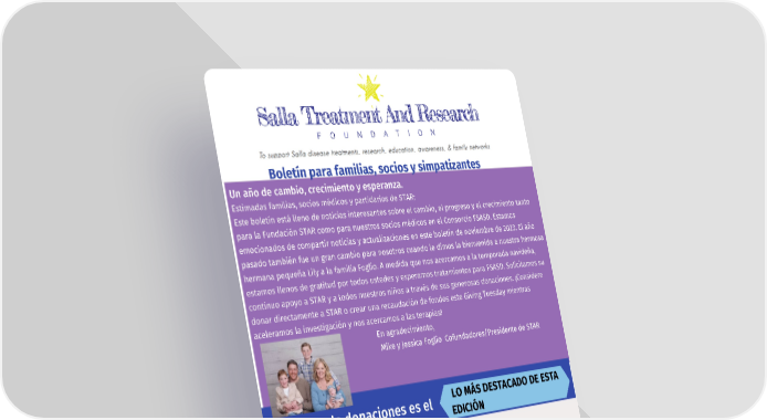 Actualizaciones Consorcio presenta nuevo logo En la literatura científica, se ha hecho referencia a la “enfermedad de Salla” de múltiples maneras. “Enfermedad de Salla” (llamada así por la región de Finlandia que alberga una gran cantidad de casos conocidos) o trastorno por almacenamiento de ácido siálico “intermedio” o “infantil”. Los miembros del consorcio utilizarán ahora el mismo término "Trastorno de almacenamiento de ácido siálico libre" (FSASD) en artículos, publicaciones y productos para crear un término común para la colaboración. El logotipo del Consorcio está lleno de simbolismo. Las estrellas representan la Fundación STAR. La estrella roja simboliza que cada paciente y grupo de investigación es único y que muchas direcciones de investigación están alineadas. Las estrellas también son un "faro de esperanza, una luz brillante que guía el camino", un símbolo de positividad, felicidad o renovación. La forma del poliedro representa la colaboración global y multidisciplinaria y, de forma abstracta, la molécula de ácido siálico. El consorcio crece hasta los 46 miembros En 2023, el consorcio FSASD habrá crecido hasta contar con 46 miembros de 18 centros de investigación en cinco países (EE. UU., Finlandia, Francia, Reino Unido y Alemania). Desde enero de 2021 se han reunido virtualmente 12 veces y dos veces en formato híbrido (presencial y virtual). Los miembros firman un acuerdo de confidencialidad después de cada reunión que permite compartir conocimientos, datos y recursos de forma gratuita. En cada reunión se enfatizan los objetivos de uno y cinco años. ¡Acelerando la investigación hacia la terapia FSASD! NOVIEMBRE 2023 PÁG 4