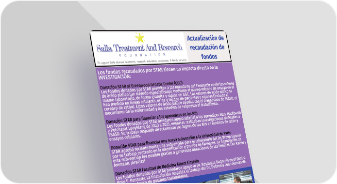 Actualización de recaudación de fondos Los fondos recaudados por STAR tienen un impacto directo en la INVESTIGACIÓN: Donación STAR al Greenwood Genetic Center (GGC): Los fondos donados por STAR permiten a los miembros del Consorcio medir los valores de ácido siálico (un método especializado) mediante el mismo método de ensayo en el mismo laboratorio, de forma gratuita y rápida en GGC. Los valores de ácido siálico se han medido en líneas celulares, orina y tejidos de pacientes y ratones (incluido el cerebro de ratón). Estos valores de ácido siálico ayudan con el diagnóstico de FSASD, el mecanismo de la enfermedad y los estudios de respuesta al tratamiento. Donación STAR para financiar a los aprendices en los NIH Los fondos donados por STAR brindaron apoyo salarial a los aprendices Mary Hackbarth y Petcharat Leoyklang de 2020 a 2023, mientras realizaban investigaciones dedicadas a FSASD. Su trabajo respaldó directamente los logros de los NIH en modelos de ratón y ensayos celulares. Donación STAR para financiar una nueva subvención a la Universidad de París: STAR aprobó recientemente una subvención para el laboratorio del Dr. Bruno Gasnier por su trabajo centrado en la identificación y prueba de fármacos. La financiación de esta subvención fue posible gracias a generosas donaciones de las familias The Kaiser y Ammann. ¡Gracias! Donación STAR Facultad de Medicina Albert Einstein Los fondos donados por STAR brindaron apoyo al Dr. Kostantin Dobrenis en el Centro Rose F. Kennedy. La financiación respalda el trabajo del Dr. Dobrenis con colonias de ratones en busca de posibles tratamientos. NOVIEMBRE 2023 PÁG. 8