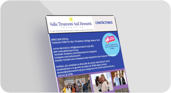 CONTÁCTENOS DIRECCION POSTAL: Fundación STAR P.O. Box 115 Golden's Bridge, Nueva York ¡Nuevo y mejorado sitio correo electrónico: [email protected] sitio web y contenido de redes web: www.sallaresearch.org sociales! facebook: facebook.com/sallaresearch instagram: instagram.com/sallaresearch linkedin: linkedin.com/company/salla-treatment-and-research-foundation Familias: ¿ha cambiado su dirección de correo electrónico? envíe actualizaciones a la gerente de datos de STAR, Agnes Jensen, [email protected] para asegurarse de recibir publicaciones y noticias de STAR. e e d e d a d a r a r g r g g A A A ! ! ú ! t ú r www.canva.com: para apoyar a nuestra organización sin fines de lucro a través de una cuenta t ú ¡ r t ¡ e r ¡ e c e c c gratuita (utilizada para crear este boletín informativo) NOVIEMBRE 2023 PÁG 12
