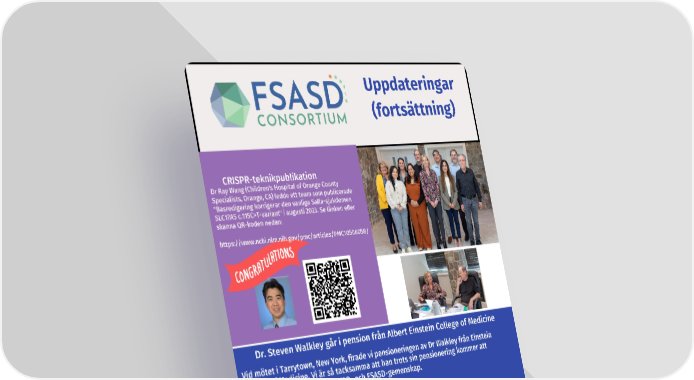 Uppdateringar (fortsättning) CRISPR-teknikpublikation Dr Ray Wang (Children's Hospital of Orange County Specialists, Orange, CA) ledde ett team som publicerade "Basredigering korrigerar den vanliga Salla-sjukdomen SLC17A5 c.115C>T-variant" i augusti 2023. Se länken eller skanna QR-koden nedan: https://www.ncbi.nlm.nih.gov/pmc/articles/PMC10506058/ Dr. Steven Walkley går i pension från Albert Einstein College of Medicine Vid mötet i Tarrytown, New York, firade vi pensioneringen av Dr Walkley från Einstein College of Medicine. Vi är så tacksamma att han trots sin pensionering kommer att fortsätta som medlem i vår STAR- och FSASD-gemenskap. Kära Dr Walkley: Tack för att du gav oss hopp och syfte mitt i vår diagnos med Ben. Det är på grund av era ansträngningar på Rose F. Kennedy Center som så många familjer som vår är motiverade att ge behandlingar för sällsynta sjukdomar. Du har ingjutit i oss en orubblig tro på att ingen sjukdom är för sällsynt för genomförbara forsknings- och behandlingsalternativ. Vi var den första familjen som var en del av ert IDRC-initiativ, och vi är säkra på att detta otroliga program för alltid kommer att vara en lysande juvel inom Rose F. Kennedy Center. Jessica och Mike NOVEMBER 2023, SID 7