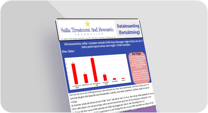 Datainsamling (fortsättning) Vid konsortiets möte i oktober delade STAR Data Manager några fakta om de 77 Salla patientpartnerna som ingår i STAR-familjen: Efter ålder: Bra fråga! En STAR-förälder noterade att 7 av de 8 patienterna vid mötet personligen var kvinnor och frågade är FSASD-störningar vanligare hos flickor? Svaret från våra kliniska partners är - Nej. Siffrorna i litteraturen är jämna efter kön. (Bara en slump att de flesta flickor var på plats!) Som du kan se är vår STAR-gemenskap internationell, bor över flera kontinenter och talar många språk. Vi kommer att göra vårt bästa för att tillhandahålla innehåll, som detta nyhetsbrev, på flera språk när det är möjligt. Du kommer också att märka att våra STAR-"barn" inte alla är barn! 32 % av våra kända STAR-patienter är vuxna (18 år eller äldre). Vid det personliga mötet delade konsortiets genetiker Dr Ray Wang hur viktigt det är för föräldrar till våra vuxna STAR-patienter att hålla sig engagerade. Det är inte tillräckligt känt om symtomförloppet under FSASD-sjukdomens liv, och bidrag från våra vuxna STAR-patienter kan hjälpa till att fylla dessa luckor. Bidrag från varje familj till STAR-datainsamlingsinsatser är så uppskattade och uppskattade! Enkät om föräldrars preferenser Tack till de 29 STAR-familjerna som svarade på vår föräldrapreferensundersökning i juli om preferenser för datainsamling. 45 % av de tillfrågade skulle vara villiga att uppdatera ett patientregister var sjätte månad; 34% sa var tredje månad. 93 % föredrar en e-postpåminnelse när det är dags att svara på enkäter. Ämnen som utvecklingsmilstolpar, aktuella hälsoproblem, livskvalitet (för både STAR-patienten och familjen) är alla viktiga för familjer att spåra såväl som olika terapier, dieter och mediciner som prövats. Familjer skulle vilja se datasvar per genvariant. I början av 2024 kommer vi att försöka börja samla in registerdata från alla våra familjer och returnera dessa data till dig så att du kan se vad andra i samhället upplever. En fullständig kopia av föräldrapreferensundersökningen kommer att skickas tillbaka till alla föräldrar i slutet av november. NOVEMBER 2023, SID 11
