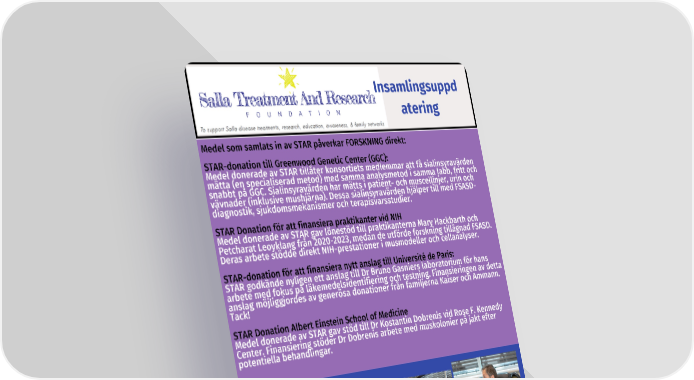 Insamlingsuppd atering Medel som samlats in av STAR påverkar FORSKNING direkt: STAR-donation till Greenwood Genetic Center (GGC): Medel donerade av STAR tillåter konsortiets medlemmar att få sialinsyravärden mätta (en specialiserad metod) med samma analysmetod i samma labb, fritt och snabbt på GGC. Sialinsyravärden har mätts i patient- och muscellinjer, urin och vävnader (inklusive mushjärna). Dessa sialinsyravärden hjälper till med FSASD- diagnostik, sjukdomsmekanismer och terapisvarsstudier. STAR Donation för att finansiera praktikanter vid NIH Medel donerade av STAR gav lönestöd till praktikanterna Mary Hackbarth och Petcharat Leoyklang från 2020-2023, medan de utförde forskning tillägnad FSASD. Deras arbete stödde direkt NIH-prestationer i musmodeller och cellanalyser. STAR-donation för att finansiera nytt anslag till Université de Paris: STAR godkände nyligen ett anslag till Dr Bruno Gasniers laboratorium för hans arbete med fokus på läkemedelsidentifiering och testning. Finansieringen av detta anslag möjliggjordes av generösa donationer från familjerna Kaiser och Ammann. Tack! STAR Donation Albert Einstein School of Medicine Medel donerade av STAR gav stöd till Dr Kostantin Dobrenis vid Rose F. Kennedy Center. Finansiering stöder Dr Dobrenis arbete med muskolonier på jakt efter potentiella behandlingar. NOVEMBER 2023, SID 8