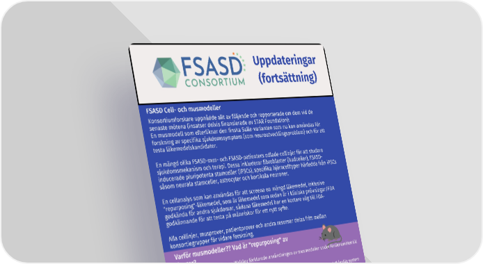 Uppdateringar (fortsättning) FSASD Cell- och musmodeller Konsortiumforskare uppnådde allt av följande och rapporterade om dem vid de senaste mötena (insatser delvis finansierade av STAR Foundation): En musmodell som efterliknar den finska Salla-varianten som nu kan användas för forskning av specifika sjukdomssymptom (som neuroutvecklingsproblem) och för att testa läkemedelskandidater. En mängd olika FSASD-mus- och FSASD-patienters odlade cellinjer för att studera sjukdomsmekanism och terapi. Dessa inkluderar fibroblaster (hudceller), FSASD- inducerade pluripotenta stamceller (iPSCs), specifika hjärncelltyper härledda från iPSCs såsom neurala stamceller, astrocyter och kortikala neuroner. En cellanalys som kan användas för att screena en mängd läkemedel, inklusive "repurposing"-läkemedel, som är läkemedel som redan är i kliniska prövningar/FDA godkända för andra sjukdomar, sådana läkemedel har en kortare väg till FDA- godkännande för att testa på människor för ett nytt syfte. Alla cellinjer, musprover, patientprover och andra resurser delas fritt mellan konsortiegrupper för vidare forskning. Varför musmodeller?? Vad är "repurposing" av droger? Konsortiets forskare Dr Steven Walkley förklarade användningen av musmodeller under föräldramötet till oktobermötet i New York. För att hitta lovande läkemedelskandidater måste de först testas i celler, än en djurmodell (enkla system som zebrafisk eller möss). Att skapa dessa modeller tar tid! NIH har skapat en musmodell med samma finska Salla-variant som finns hos människor. Mössen föds och verkar normala, utvecklar sedan sjukdomen långsamt (de kan leva i många månader), så olika läkemedelsbehandlingar kan testas på dem. Om det är lovande, och om läkemedlet ännu inte har testats på människor, skulle de behöva testas på större djur först. Om ett läkemedel tidigare har testats på en människa (men av en annan sjukdom eller anledning), kan det "återanvändas" och potentiellt användas för att behandla en ny sjukdom, som FSASD. Ett "läkemedel med återanvändning", eftersom det redan har visat sig vara säkert för en människa, skulle i teorin vara tillgängligt för riktiga patienter snabbare. Konsortiets plan (om finansiering finns tillgänglig) är att påskynda processen genom att låta flera laboratorier testa läkemedel samtidigt. Detta är arbetsintensivt arbete och kräver investeringar. NOVEMBER 2023, SID 6