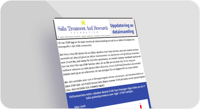 Uppdatering av datainsamling I år har STAR lagt en förnyad tonvikt på datainsamling och att ha en bättre förståelse för demografin i vårt STAR-community. Det finns cirka 250 kända fall av Sallas sjukdom över hela världen, men det antalet kommer sannolikt att växa på grund av bättre medvetenhet om sjukdomen och genetiska testplatser som 23 och Me, som testar för SLC17A5-varianterna. Vid mötet i oktober berättade Jessica att hon har hört från nya STAR-familjer efter att de fått testresultat från 23 och mig som indikerar närvaron av Salla-genen (eller bäraren), och en STAR-familjemedlem på samtalet delade med sig av sin erfarenhet när hon äntligen fick en diagnos för sin vuxna dotter. När vårt samhälle växer och vi förhoppningsvis närmar oss terapier, på rekommendation av både STAR SAB- och FSASD-konsortiets läkare, kommer STAR att starta om ett patientregister 2024. MER INFORMATION KOMMER SNART! Vid konsortiets möte i oktober delade STAR Data Manager några fakta om de 77 Salla patientpartnerna som ingår i STAR-familjen: Efter land: NOVEMBER 2023, SID 10