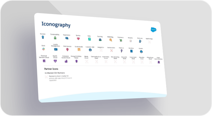 Iconography Success Sustainability Experience Service Sales Learning Marketing Commerce Analytics Work.com AppExchange Loyalty Slack Management Field Service Social Studio Customer 360 Integration Collaboration Platform Workflow Einstein Financial Health Consumer Energy & Utilities Media Communications Automotive Manufacturing Nonprofit Government Education Philanthropy Public Services Cloud Cloud Goods Cloud Cloud Cloud Cloud Cloud Cloud Cloud Cloud Cloud Cloud Sector Solutions Partner Icons In-Market ISV Partners Represents where in-market ISV partners offer apps that fit L1 and L2 capabilities