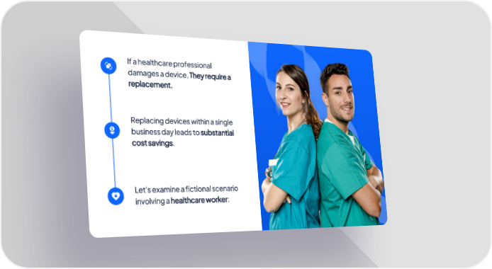 If a healthcare professional damages a device, They require a replacement. Replacing devices within a single business day leads to substantial cost savings. Let's examine a fictional scenario involving a healthcare worker: