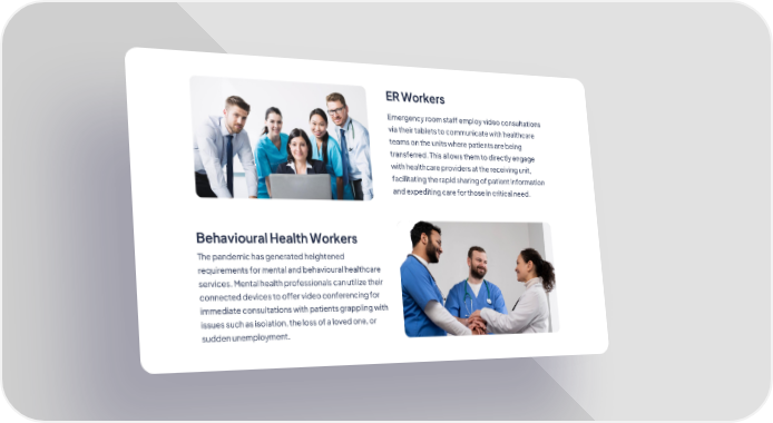 ER Workers Emergency room staff employ video consultations via their tablets to communicate with healthcare teams on the units where patients are being transferred. This allows them to directly engage with healthcare providers at the receiving unit, facilitating the rapid sharing of patient information and expediting care for those in critical need. Behavioural Health Workers The pandemic has generated heightened requirements for mental and behavioural healthcare services. Mental health professionals can utilize their connected devices to offer video conferencing for immediate consultations with patients grappling with issues such as isolation, the loss of a loved one, or sudden unemployment.