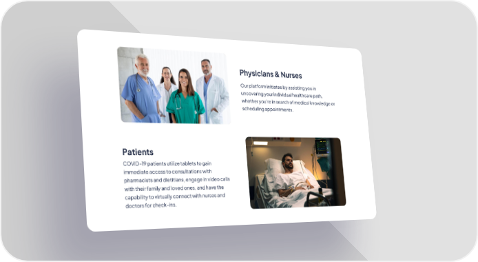 Physicians & Nurses Our platform initiates by assisting you in uncovering your individual healthcare path, whether you're in search of medical knowledge or scheduling appointments. Patients COVID-19 patients utilize tablets to gain immediate access to consultations with pharmacists and dietitians, engage in video calls with their family and loved ones, and have the capability to virtually connect with nurses and doctors for check-ins.