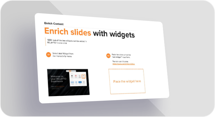 Enrich Content Enrich slides with widgets 1000+ out-of-the-box widgets can be added in RELAYTO/ in one click Select Add Widget from Paste the video url on the 01 02 the interactivity menu “add widget” input form. You can use this one: https://youtu.be/Kj7EkHKSRxs Place the widget here