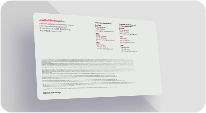 Join the ESG discussion. For investors please contact: For issuers, intermediaries and Americas all others please contact: Visit www.spglobal.com/sustainable-昀椀nance Enrique Gutierrez Americas Email [email protected] +1-212-438-0328 Enrique Gutierrez Or contact your local S&P Global Ratings [email protected] +1-212-438-0328 Sustainability representative. [email protected] EMEA Geraldine Cametti EMEA +33-14-420-7342 Geert Arlman [email protected] +44-20-7176-2184 [email protected] APAC Hsin-Ying Lee APAC +65-6216-1079 Erik Christianto [email protected] +65-6597-6158 [email protected] No content (including ratings, credit-related analyses and data, valuations, model, software or other application or output therefrom) or any part thereof (Content) may be modi昀椀ed, reverse engineered, reproduced or distributed in any form by any means, or stored in a database or retrieval system, without the prior written permission of Standard & Poor’s Financial Services LLC or its af昀椀liates (collectively, S&P). The Content shall not be used for any unlawful or unauthorized purposes. S&P and any third-party providers, as well as their directors, of昀椀cers, shareholders, employees or agents (collectively S&P Parties) do not guarantee the accuracy, completeness, timeliness or availability of the Content. S&P Parties are not responsible for any errors or omissions (negligent or otherwise), regardless of the cause, for the results obtained from the use of the Content, or for the security or maintenance of any data input by the user. The Content is provided on an “as is” basis. S&P PARTIES DISCLAIM ANY AND ALL EXPRESS OR IMPLIED WARRANTIES, INCLUDING, BUT NOT LIMITED TO, ANY WARRANTIES OF MERCHANTABILITY OR FITNESS FOR A PARTICULAR PURPOSE OR USE, FREEDOM FROM BUGS, SOFTWARE ERRORS OR DEFECTS, THAT THE CONTENT’S FUNCTIONING WILL BE UNINTERRUPTED OR THAT THE CONTENT WILL OPERATE WITH ANY SOFTWARE OR HARDWARE CONFIGURATION. In no event shall S&P Parties be liable to any party for any direct, indirect, incidental, exemplary, compensatory, punitive, special or consequential damages, costs, expenses, legal fees, or losses (including, without limitation, lost income or lost pro昀椀ts and opportunity costs or losses caused by negligence) in connection with any use of the Content even if advised of the possibility of such damages. Credit-related and other analyses, including ratings, and statements in the Content are statements of opinion as of the date they are expressed and not statements of fact. S&P’s opinions, analyses and rating acknowledgment decisions (described below) are not recommendations to purchase, hold, or sell any securities or to make any investment decisions, and do not address the suitability of any security. S&P assumes no obligation to update the Content following publication in any form or format. The Content should not be relied on and is not a substitute for the skill, judgment and experience of the user, its management, employees, advisors and/or clients when making investment and other business decisions. S&P does not act as a 昀椀duciary or an investment advisor except where registered as such. While S&P has obtained information from sources it believes to be reliable, S&P does not perform an audit and undertakes no duty of due diligence or independent veri昀椀cation of any information it receives. To the extent that regulatory authorities allow a rating agency to acknowledge in one jurisdiction a rating issued in another jurisdiction for certain regulatory purposes, S&P reserves the right to assign, withdraw or suspend such acknowledgement at any time and in its sole discretion. S&P Parties disclaim any duty whatsoever arising out of the assignment, withdrawal or suspension of an acknowledgment as well as any liability for any damage alleged to have been suffered on account thereof. S&P keeps certain activities of its business units separate from each other in order to preserve the independence and objectivity of their respective activities. As a result, certain business units of S&P may have information that is not available to other S&P business units. S&P has established policies and procedures to maintain the con昀椀dentiality of certain non-public information received in connection with each analytical process. S&P may receive compensation for its ratings and certain analyses, normally from issuers or underwriters of securities or from obligors. S&P reserves the right to disseminate its opinions and analyses. S&P’s public ratings and analyses are made available on its Web sites, www.standardandpoors.com (free of charge), and www.ratingsdirect.com and www.globalcreditportal.com (subscription), and may be distributed through other means, including via S&P publications and third-party redistributors. Additional information about our ratings fees is available at www.standardandpoors.com/usratingsfees. Copyright © 2022 by Standard & Poor’s Financial Services LLC. All rights reserved.STANDARD & POOR’S, S&P and RATINGSDIRECT are registered trademarks of Standard & Poor’s Financial Services LLC. spglobal.com/ratings