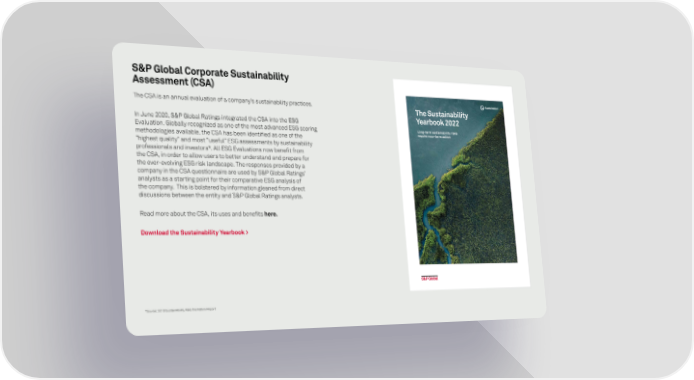 S&P Global Corporate Sustainability Assessment (CSA) The CSA is an annual evaluation of a company’s sustainability practices. The Sustainability In June 2020, S&P Global Ratings integrated the CSA into the ESG Yearbook 2022 Evaluation. Globally recognized as one of the most advanced ESG scoring Long-term sustainability risks methodologies available, the CSA has been identi昀椀ed as one of the require near-term action “highest quality” and most “useful” ESG assessments by sustainability professionals and investors*. All ESG Evaluations now bene昀椀t from the CSA, in order to allow users to better understand and prepare for the ever-evolving ESG risk landscape. The responses provided by a company in the CSA questionnaire are used by S&P Global Ratings’ analysts as a starting point for their comparative ESG analysis of the company. This is bolstered by information gleaned from direct discussions between the entity and S&P Global Ratings analysts. Read more about the CSA, its uses and bene昀椀ts here. Download the Sustainability Yearbook > *Source: 2019 SustainAbility Rate the Raters Report