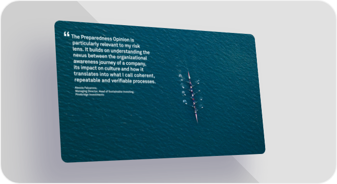 “The Preparedness Opinion is particularly relevant to my risk lens. It builds on understanding the nexus between the organizational awareness journey of a company, its impact on culture and how it translates into what I call coherent, repeatable and veri昀椀able processes. Alessia Falsarone, Managing Director, Head of Sustainable Investing, Pinebridge Investments