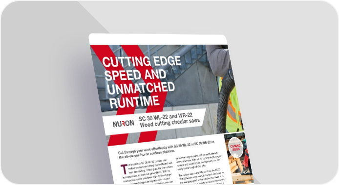 CUTTING EDGE SPEED AND UNMATCHED RUNTIME SC 30 WL-22 and WR-22 Wood cutting circular saws Cut through your work effortlessly with SC 30 WL-22 or SC 30 WR-22 on the all-on-one Nuron cordless platform. COMING MORE RUNTIME he brushless SC 30 WL-22 circular saw versus the long-standing 15A corded blade-left SOON PER CHARGE makes production cutting more efficient and worm-drive saw. With a 2-⅜" cutting depth, longer Tless demanding, offering double the runtime runtime and superior heat management, you can in comparison to previous generations. With no easily tackle tough all-day jobs. more power cords and fewer trips to the charger, WORK ALL you can keep things running smoothly on your The newest saw in the Hilti portfolio, the SC 30 Cuts faster than any DAY ON ONE jobsite. No matter the blade orientation, you can WR-22 leaves other saws in the dust. Designed for other tool in its class CHARGE expect cordless without compromise. the everyday grind on the jobsite, this blade-right 7-¼" circular saw is built to boost your productivity The SC 30 WL-22 has been redesigned to take with faster speeds, the best cutting depth and a full advantage of the high power delivered by the virtually dust-free cutting experience. TRIPLE THE Nuron battery and deliver the best performance CUTTING APPLICATIONS ADVANTAGES SPEED SC 30 WL-22 & SC 30 WR-22 SC 30 WL-22 & SC 30 WR-22 Ergonomics help • Bevel cuts — the SC 30 WL-22 can cut at 0–50° angles, and the • Designed for comfortable control — weighing in enable quick, SC 30 WR-22 at 45° in materials up to 2" or at 50° up to 1.77" thickness under 12 lbs. with a B-170 battery, the rear handle precise cuts • Cutting solid wood — the SC 30 WL-22 and SC 30 WR-22 cut grip makes precise cuts quicker and easier production wood, hardwoods, battens and pressure-treated lumber • LED light enhances visibility • Cutting wood-based board — the SC 30 WL-22 and SC 30 WR-22 cut • Virtually dust-free sawing — by attaching optional HDO, MDO, plywood and OSB adapter for use with a vacuum • Cross and rip cuts — the SC 30 WL-22 cuts through wood or plastic • Highest cutting depth — the SC 30 WR-22 can cut • Trimming interior finishing board — the SC 30 WL-22 cuts drywall through three ¾ in. wood boards in a single pass and sandwich boards 21 75$&.