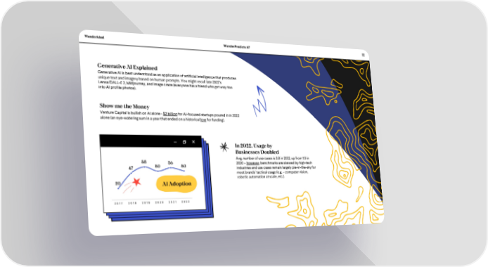 WunderPredicts #7 Generative AI Explained Generative AI is best understood as an application of artificial intelligence that produces unique text and imagery based on human prompts. You might recall late 2022’s Lensa/DALL-E 2, Midjourney, andimage craze (everyone has a friend who got way too into AI profile photos). Show me the Money Venture Capital is bullish on AI alone -$2 billionfor AI-focused startups poured in in 2022 alone (an eye-watering sum in a year that ended on a historical low for funding). In 2022, Usage by Businesses Doubled 58 Avg. number of use cases is 3.8 in 2022, up from 1.9 in 50 56 50 2020 –however, benchmarks are skewed by high-tech 47 industries and use cases remain largely pie-in-the-sky for most brands’ tactical usage (e.g. –computer vision, robotic automation at scale, etc.) 20 AI Adoption 2017 2018 2019 2020 2021 2022