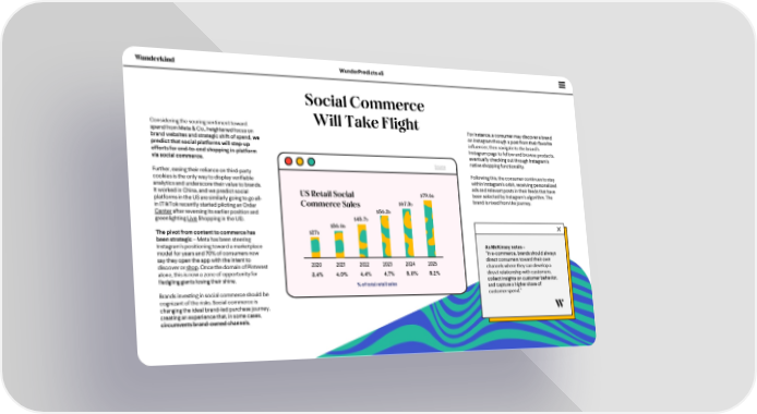 WunderPredicts #5 Social Commerce Considering the souring sentiment toward Will Take Flight For instance, a consumer may discover a brand spend from Meta & Co., heightened focus on on Instagram through a post from their favorite brand websites and strategic shift of spend, we influencer, then navigate to the brand’s predict that social platforms will step-up Instagram page to follow and browse products, efforts for end-to-end shopping in-platform eventually checking out through Instagram’s via social commerce. Source native shopping functionality. Further, easing their reliance on third-party Following this, the consumer continues to stay cookies is the only way to display verifiable within Instagram’s orbit, receiving personalized analytics and underscore their value to brands. ads and relevant posts in their feeds that have It worked in China, and we predict social US Retail Social $79.6b been selected by Instagram’s algorithm. The platforms in the US are similarly going to go all- Commerce Sales $67.3b brand is nixed from the journey. in (TikTok recently started piloting an Order $56.2b Centerafter reversing its earlier position and greenlighting LiveShopping in the US). $45.7b $36.6b The pivot from content to commerce has $27b been strategic –Meta has been steering Instagram’s positioning toward a marketplace As McKinsey notes – model for years and 70% of consumers now “In e-commerce, brands should always say they open the app with the intent to 2020 2021 2022 2023 2024 2025 direct consumers toward their own discover or shop. Once the domain of Pinterest channels where they can develop a alone, this is now a zone of opportunity for 3.4% 4.0% 4.4% 4.7% 5.0% 5.2% direct relationship with customers, fledgling giants losing their shine. collect insights on customer behavior, % of total retail sales and capture a higher share of Brands investing in social commerce should be customer spend.” cognizant of the risks. Social commerce is changing the ideal brand-led purchase journey, creating an experience that, in some cases, circumvents brand-owned channels.