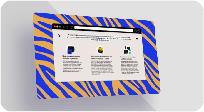 Wunderkind is the performance marketing engine, powered by people–and we’ve championed privacy, creativity, and the power of the individual before it was cool. Here’s how we can partner to make 2023 the best one yet. Make the most of your Drive better performance and Invest in non-intrusive Website experience returns with Text + Email Ads that perform With the unparalleled scale of our Owned channels are the center of gravity of your WunderKIND Ads personifies its name – Identity Network, Wunderkind can help brand –now more than ever. Marketers have uniquely benefitting advertisers, publishers, you power your List Growth strategy doubled down on the efficiency of websites, andusers, by being rooted in a respect for that deliver more opt-ins than other email, text messaging, and mobile apps to make user experience. We offer the only high- leading solutions. This allows you to up for lost revenue and keep consumers engaged. impact, post-content ads in the market -i.e., target previously unavailable mid-funnel Not only do these Wunderkind channels drive our ads appear to users when they are prospects and drive net-new revenue revenue with efficiency and at scale, they’re also finished engaging with publisher content; from your email + text programs. far more secure than the traditional social media the most receptive juncture in their journey. platforms, placing the ownership of your customer Oh, and our performance metrics outpace data in your hands. industry benchmarks handily.