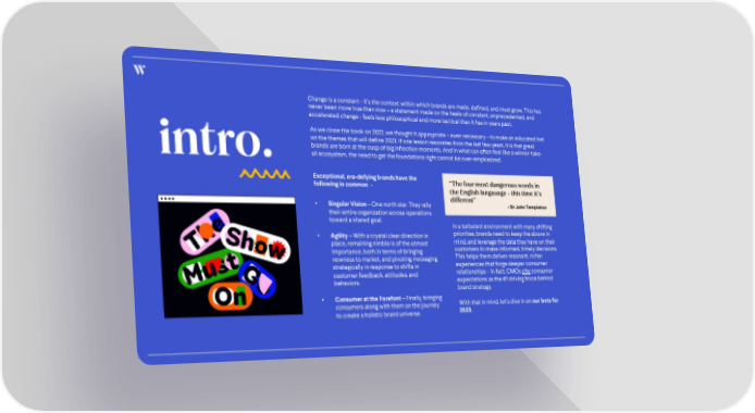 Change is a constant -it’s the context within which brands are made, defined, and must grow. This has never been more true than now –a statement made on the heels of constant, unprecedented, and accelerated change -feels less philosophical and more tactical than it has in years past. As we close the book on 2022, we thought it appropriate –even necessary –to make an educated bet on the themes that will define 2023. If one lesson resonates from the last few years, it is that great brands are born at the cusp of big inflection moments.And in what can often feel like a winner-take- intro. all ecosystem, the need to get the foundations right cannot be over-emphasized. Exceptional, era-defying brands have the “The four most dangerous words in following in common – the English langauage -this time it’s • Singular Vision–One north star. They rally different” - Sir John Templeton their entire organization across operations toward a shared goal. In a turbulent environment with many shifting • Agility –With a crystal clear direction in priorities, brands need to keep the above in place, remaining nimble is of the utmost mind, and leverage the data they have on their importance, both in terms of bringing customers to make informed, timely decisions. newness to market, and pivoting messaging This helps them deliver resonant, richer strategically in response to shifts in experiences that forge deeper consumer customer feedback, attitudes, and relationships –in fact, CMOs citeconsumer behaviors. expectations as the #1 driving force behind brand strategy. • Consumer at the Forefont –Finally, bringing With that in mind, let’s dive in on our bets for consumers along with them on the journey 2023. to create a holistic brand universe.