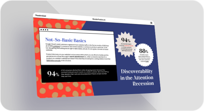 WunderPredicts #5 Not-So-Basic Basics 94% of consumers report Google Cloud’s retail customers registered more website traffic in the first six months of 2022 than receiving irrelevant results all of 2019 combined. E-commerce and owned website e-commerce activity in particular, is red on retailer websites hot. But getting the building blocks right is table stakes, and yet, it’s not a given, not even on brand (something brands are websites. seemingly aware of) 88% Product discovery on your website is not an arena within which you can afford to fumble and this of retailers report pervasive error drives the surge in search abandonment(i.e., when a consumer searches for a search abndonment is a product on a retailer’s website but doesn’t find what they’re looking for), costing retailers more than core issue they contend with, and it costs them $300 billion annuallyin the US alone. customer loyalty of US consumers ditched their online shopping session because they received irrelevant search results on a retailer’s website. More than half say Discoverability 94% they abandon their carts and shop elsewhere if there’s at least one item they can’t find. in the Attention Recession
