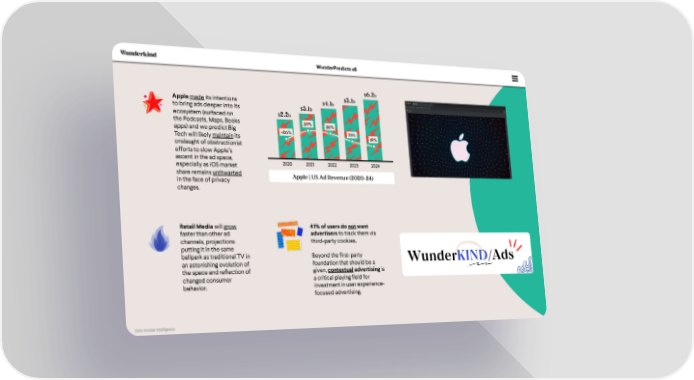WunderPredicts #6 $6.2b Applemadeits intentions $4.1b $5.1b to bring ads deeper into its $3.1b ecosystem (surfaced on $2.2b the Podcasts, Maps, Books 39% 36% apps) and we predict Big +26% 25% Tech will likely maintain its 19% onslaught of obstructionist efforts to slow Appleās ascent in the ad space, 2020 2021 2022 2023 2024 especially as iOS market share remains unthwarted Apple | US Ad Revenue (2020-24) in the face of privacy changes. Retail Media will grow 41% of users do notwant faster than other ad advertisers to track them via channels, projections third-party cookies. putting it in the same ballpark as traditional TV in Beyond the first-party WunderKIND/Ads an astonishing evolution of foundation that should be a the space and reflection of given, contextualadvertising is changed consumer a critical playing field for behavior. investment in user experience- focused advertising. Data | Insider Intelligence
