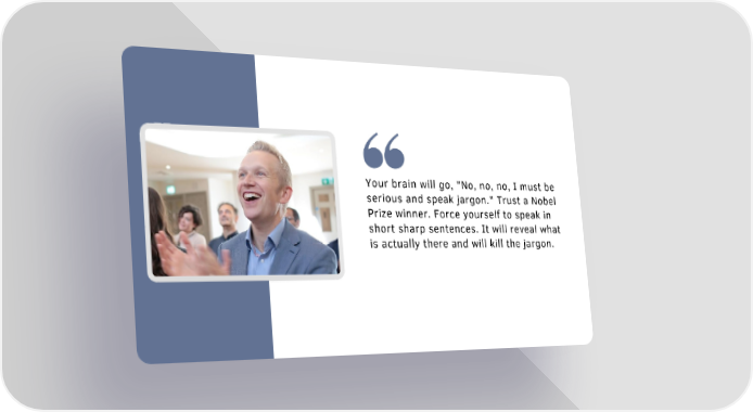 Your brain will go, "No, no, no, I must be serious and speak jargon." Trust a Nobel Prize winner. Force yourself to speak in short sharp sentences. It will reveal what is actually there and will kill the jargon.