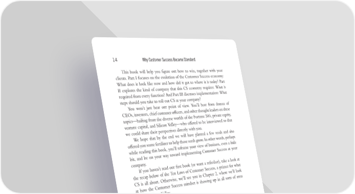 Trim Size: 6in x 9in Mehta572763 c01.tex V1-04/03/2020 11:45pm Page 14 14 WhyCustomerSuccessBecameStandard This book will help you figure out how to win, together with your clients. Part I focuses on the evolution of the Customer Success economy: What does it look like now and how did it get to where it is today? Part II explores the kind of company that this CS economy requires: What is required from every function? And Part III discusses implementation: What steps should you take to roll out CS at your company? You won’t just hear our point of view. You’ll hear from dozens of CEOs,investors,chiefcustomerofocers,andotherthoughtleadersonthese topics—hailing from the diverse worlds of the Fortune 500, private equity, venture capital, and Silicon Valley—who offered to be interviewed so that wecould share their perspectives directly with you. We hope that by the end we will have planted a few seeds and also offered you some fertilizer to help those seeds grow. In other words, perhaps while reading this book, you’ll reframe your view of business, even a little bit, and be on your way toward implementing Customer Success at your company. If you haven’t read our first book (or want a refresher), take a look at the recap below of the Ten Laws of Customer Success, a primer for what CS is all about. Otherwise, we’ll see you in Chapter 2, where we’ll look at how the Customer Success mindset is showing up in all sorts of areas outside Silicon Valley. The Ten Laws of Customer Success Here’s a brief overview of the Ten Laws of Customer Success. For the full explanation and practical examples, head over to our website at gainsight.com/resource/the-10-laws-of-customer-success and download the booklet. Law#1:Customer Success Is a Top-Down, Company-Wide Commitment Weintroduced this concept in 2016, and we believe it even more strongly today. Customer Success is a true business revolution, and it’s here to stay. Donewell,itdrivesrealvaluetoyourbusiness’sbottomline.Ifyou’renoton board yet, you will be soon. The demands of today’s customers and changes