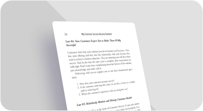 Trim Size: 6in x 9in Mehta572763 c01.tex V1-04/03/2020 11:45pm Page 16 16 WhyCustomerSuccessBecameStandard Law#4:YourCustomers Expect You to Make Them Wildly Successful Customers don’t buy your solution just for its features and functions. They buy your offering (and buy into the relationship with you) because they want to achieve a business objective. They are assuming you will drive their success. And, by the time the sales cycle is complete, their expectations are really high. Don’t waste time complaining about the fairness of this attitude; just acknowledge and work with it. Delivering wild success requires you to ask three fundamental ques- tions: 1. How does your customer measure success? 2. Is the customer achieving that value (or are they at least on a realistic path to achieving it)? 3. What’s the customer’s experience with you along the way? Law#5:Relentlessly Monitor and Manage Customer Health Customer Health is at the heart of Customer Success. It not only informs your actions, it actually drives appropriate action when used properly. Cus- tomerHealthistoCustomerSuccesswhatthesalespipelineistoasalesVP’s planning info—the predictor of future customer behavior. So just as sales VPs manage through their pipeline, Customer Success teams must man- age through customer health. Monitoring and managing customer health is a core activity for Customer Success teams. It must be done and done well—even relentlessly. Law#6:YouCanNoLongerBuildLoyalty through Personal Relationships Oneofthevaluesofmoderntechnologyisthatitmakesourproductsmuch easier to buy for our customers. This almost always leads to a “long tail” of lower-value customers who, in most companies, end up being ignored. The best companies will figure out how to effectively and efociently manage this large base of customers.
