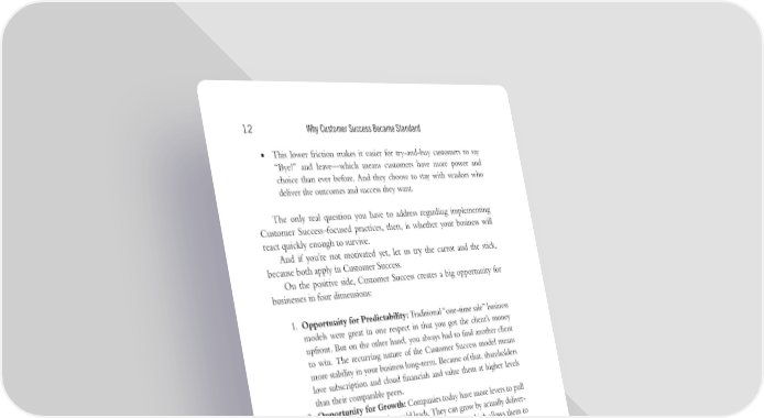 Trim Size: 6in x 9in Mehta572763 c01.tex V1-04/03/2020 11:45pm Page 12 12 WhyCustomerSuccessBecameStandard ◾ This lower friction makes it easier for try-and-buy customers to say “Bye!” and leave—which means customers have more power and choice than ever before. And they choose to stay with vendors who deliver the outcomes and success they want. The only real question you have to address regarding implementing Customer Success–focused practices, then, is whether your business will react quickly enough to survive. And if you’re not motivated yet, let us try the carrot and the stick, because both apply in Customer Success. On the positive side, Customer Success creates a big opportunity for businesses in four dimensions: 1. OpportunityforPredictability:Traditional“one-timesale”business models were great in one respect in that you got the client’s money upfront. But on the other hand, you always had to find another client to win. The recurring nature of the Customer Success model means morestability in your business long-term. Because of that, shareholders love subscription and cloud financials and value them at higher levels than their comparable peers. 2. Opportunity for Growth: Companies today have more levers to pull for sales than prospecting cold leads. They can grow by actually deliver- ing on the vision they pitched in the sales cycle, which allows them to expandtheirexisting client relationships and attract new buyers through warm referrals from happy clients. 3. Opportunity for Innovation: Customer Success and the data you get from a deep client relationship allows you to grow your business like neverbefore. Perhaps you offer software for small business management, and you then realize that your clients also have a challenge accepting payments. With the intimacy of the Customer Success model, you are able to more rapidly launch new offerings for your clients. 4. Opportunity of Balance: Finally, we’ll argue throughout the book that companies that adopt the Customer Success model are just better. They balance the needs of all of their stakeholders— customers, teammates, community, shareholders—in a way that works for everyone. But if you’re not motivated by that, let’s look at the other side of the coin—the four risks of not investing in Customer Success: