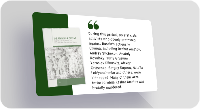 During this period, several civiŃ activists who openly protested against Russia's actions in Crimea, including Reshat Ametov, Andrey Shchekun, Anatoly Kovalsky, Yuriy Gruzinov, Yaroslav Pilunskiy, Alexey Gritsenko, Sergey Suprun, Natalia Luk'yanchenko and others, were kidnapped. Many of them were tortured while Reshat Ametov was brutally murdered.
