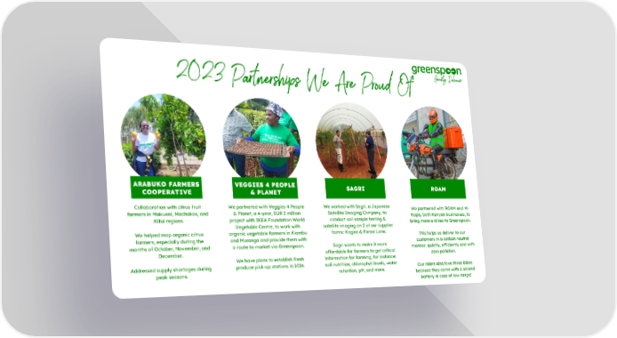2023 Partnerships We Are Proud Of ARABUKO FARMERS VEGGIES 4 PEOPLE SAGRI ROAM COOPERATIVE & PLANET Collaboration with citrus fruit We partnered with Veggies 4 People We worked with Sagri, a Japanese We partnered with ROAM and M- farmers in Makueni, Machakos, and & Planet, a 4-year, EUR 2 million Satellite Imaging Company, to Kopa, both Kenyan businesses, to Kitui regions. project with IKEA Foundation World conduct soil sample testing & bring more e-bikes to Greenspoon. Vegetable Centre, to work with satellite imaging on 2 of our supplier We helped map organic citrus organic vegetable farmers in Kiambu farms: Kagira & Farasi Lane. This helps us deliver to our farmers, especially during the and Muranga and provide them with customers in a carbon neutral months of October, November, and a route to market via Greenspoon. Sagri wants to make it more manner, quietly, efficiently and with December. affordable for farmers to get critical zero pollution. We have plans to establish fresh information for farming, for instance: Addressed supply shortages during produce pick-up stations in 2024. soil nutrition, chlorophyll levels, water Our riders also love these bikes peak seasons. retention, pH, and more. because they come with a second battery in case of low range!