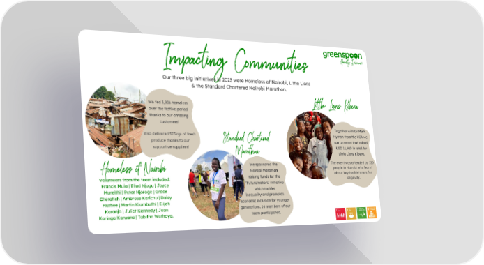Impacting Communities Our three big initiatives in 2023 were Homeless of Nairobi, Little Lions & the Standard Chartered Nairobi Marathon. We fed 3,806 homeless Little Lions Kibera over the festive period thanks to our amazing customers! Together with Dr Mark Also delivered 575kgs of fresh Hyman from the USA we Standard Chartered produce thanks to our ran an event that raised supportive suppliers! USD 11,400 in total for Marathon Little Lions Kibera. We sponsored the The event was attended by 120 people in Nairobi who learnt Homeless of Nairobi Nairobi Marathon raising funds for the about key health tenets for Volunteers from the team included: longevity. ‘Futuremakers’ initiative Francis Muia | Eliud Njogu | Joyce which tackles Mureithi | Peter Njoroge | Grace inequality and promotes Cherotich | Ambrose Karichu | Daisy economic inclusion for younger Muthee | Martin Kiambuthi | Elijah generations. 14 members of our Karanja | Juliet Kennedy | Jean Karingo Karuana | Tabitha Wothaya. team participated.