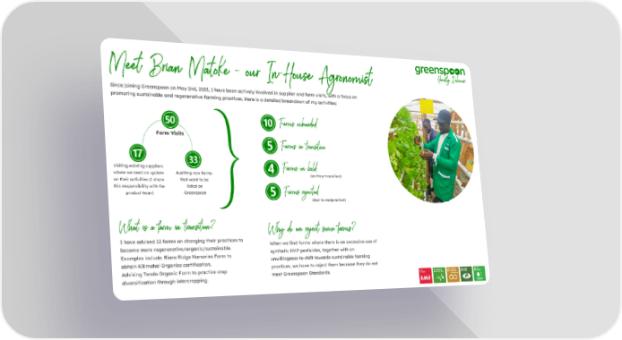 Meet Brian Matoke - our In-House Agronomist Since joining Greenspoon on May 2nd, 2023, I have been actively involved in supplier and farm visits, with a focus on promoting sustainable and regenerative farming practices. Here is a detailed breakdown of my activities: Farms onboarded Farm Visits Farms in transition Visiting existing suppliers Farms on hold Auditing new farms where we need an update (as they transition) that want to be on their activities (I share listed on this responsibility with the Farms rejected Greenspoon product team) (due to malpractice) What is a farm in transition? Why do we reject some farms? I have advised 12 farms on changing their practices to When we find farms where there is an excessive use of become more regenerative/organic/sustainable. synthetic HHP pesticides, together with an Examples include: Riara Ridge Nurseries Farm to unwillingness to shift towards sustainable farming obtain Kilimohai Organics certification. practices, we have to reject them because they do not Advising Tendo Organic Farm to practice crop meet Greenspoon Standards. diversification through intercropping.