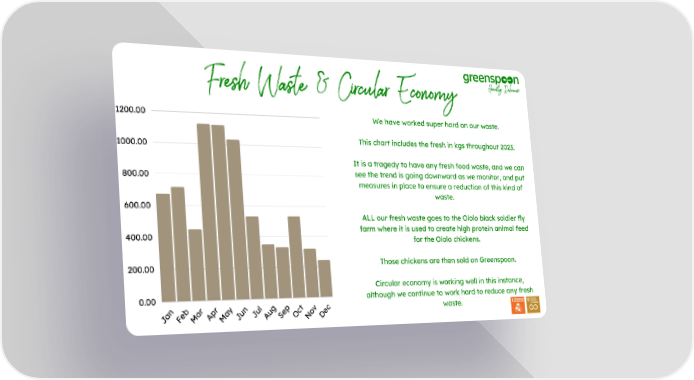 Fresh Waste & Circular Economy 1200.00 We have worked super hard on our waste. This chart includes the fresh in kgs throughout 2023. 1000.00 It is a tragedy to have any fresh food waste, and we can see the trend is going downward as we monitor, and put 800.00 measures in place to ensure a reduction of this kind of waste. 600.00 ALL our fresh waste goes to the Ololo black soldier fly farm where it is used to create high protein animal feed 400.00 for the Ololo chickens. Those chickens are then sold on Greenspoon. 200.00 Circular economy is working well in this instance, although we continue to work hard to reduce any fresh 0.00 y g waste. v ul u un an eb J Apr Oct Sep J J F A Dec Mar No Ma