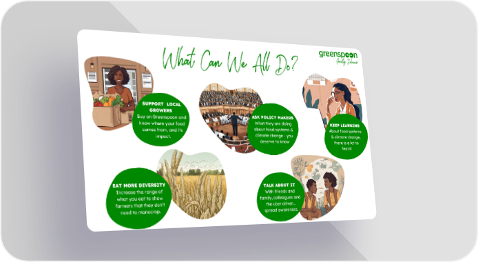 What Can We All Do? SUPPORT LOCAL GROWERS ASK POLICY MAKERS Buy on Greenspoon and What they are doing KEEP LEARNING know where your food about food systems & About food systems comes from, and its climate change - you & climate change, impact. deserve to know there is a lot to learn! EAT MORE DIVERSITY TALK ABOUT IT Increase the range of With friends and what you eat to show family, colleagues and farmers that they don’t the uber driver... need to monocrop. spread awareness.