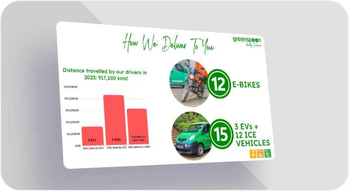 How We Deliver To You Distance travelled by our drivers in 2023: 917,100 kms! E-BIKES 500,000.00 400,000.00 300,000.00 200,000.00 3 EVs + 100,000.00 12 E-Bikes & 3 3 EVs 9 ICEs 12 ICE petrol bikes. 0.00 KMs done by EVs KMs done by ICE KMs done by e-bike VEHICLES