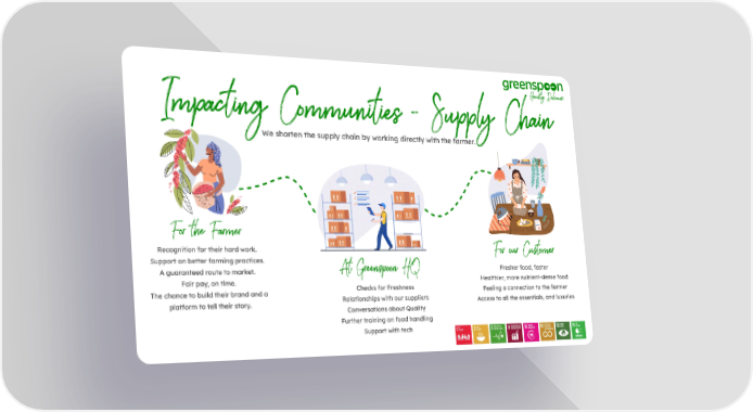 Impacting Communities - Supply Chain We shorten the supply chain by working directly with the farmer. For the Farmer Recognition for their hard work. For our Customer Support on better farming practices. A guaranteed route to market. At Greenspoon HQ Fresher food, faster Fair pay, on time. Healthier, more nutrient-dense food The chance to build their brand and a Checks for Freshness Feeling a connection to the farmer platform to tell their story. Relationships with our suppliers Access to all the essentials, and luxuries Conversations about Quality Further training on food handling Support with tech