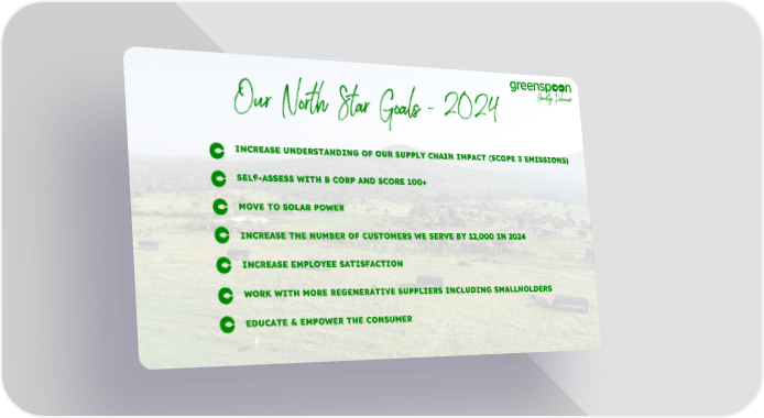 Our North Star Goals - 2024 INCREASE UNDERSTANDING OF OUR SUPPLY CHAIN IMPACT (SCOPE 3 EMISSIONS) SELF-ASSESS WITH B CORP AND SCORE 100+ MOVE TO SOLAR POWER INCREASE THE NUMBER OF CUSTOMERS WE SERVE BY 12,000 IN 2024 INCREASE EMPLOYEE SATISFACTION WORK WITH MORE REGENERATIVE SUPPLIERS INCLUDING SMALLHOLDERS EDUCATE & EMPOWER THE CONSUMER
