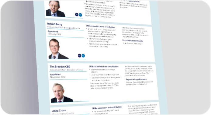Strategic Shareholder Climate and Risk Financial Financial Barclays PLC 144 report information sustainability report Governance review review statements Annual Report 2022 Directors’ report: Our Board of Directors (continued) Management for KPMG Europe LLP and as Skills, experience and contribution: Mike Ashley KPMG UK's Ethics Partner. Mike will retire • specialised knowledge of accounting and Independent Non-Executive Director from the Board with effect from the audit related matters conclusion of the 2023 AGM. Appointed: • extensive experience of auditing large September 2013 international financial institutions Key current appointments: • deep financial services and regulatory Member, Cabinet Office Board; Member, UK knowledge and experience. Endorsement Board; Treasurer, The Scout Association Mike previously worked at KPMG for over 20 years. Mike's former roles include acting as the lead engagement partner on the audits of large financial services groups including HSBC, Standard Chartered and the Bank of England, as Head of Quality and Risk Robert has robust risk management Skills, experience and contribution: Robert Berry expertise having had a 28-year career at • proven track record of management of Independent Non-Executive Director Goldman Sachs, where, prior to his risk exposure for a global financial retirement in 2018, he held the role of Co- Appointed: institution and building a modern group- Deputy Chief Risk Officer. February 2022 wide risk management organisation • strong record of integrating risk Key current appointments: management with strategy Board President, Alina Lodge • significant experience in finance, model development and trading. He had a distinguished career with Legal & Skills, experience and contribution: Tim Breedon CBE General, where, among other roles, he was • significant experience in strategic Independent Non-Executive Director the Group Chief Executive Officer until June planning 2012. Tim also served as Chair of the Appointed: • extensive financial services experience Association of British Insurers. November 2012 • detailed knowledge of risk management Key current appointments: and UK and EU regulation. Chairman, Apax Global Alpha Limited; Non- Tim is a member of the Board and is also Executive Director, Quilter PLC Chair of Barclays Bank Ireland PLC (also referred to as Barclays Europe). Prior to joining Barclays, Anna worked in both Skills, experience and contribution: Anna Cross banking and retail and held various roles at • extensive accounting and financial Group Finance Director Asda, HBOS and Lloyds Banking Group. services expertise Since joining Barclays in 2013, Anna was Appointed: • deep understanding of banking and retail appointed Chief Financial Officer of Barclays April 2022 sectors Bank UK PLC in 2016, Group Financial • significant financial leadership experience Controller in 2019 and Deputy Group of financial institutions. Finance Director in 2020. She joined the Group Executive Committee in February Anna is a chartered accountant and Group 2022, before taking up the role of Group Finance Director with responsibility for Finance Director in April 2022. Finance, including Tax, Treasury, Investor Relations and Strategy. Key current appointments: None