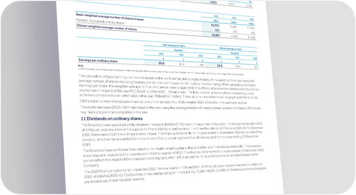 Strategic Shareholder Climate and Risk Financial Financial Barclays PLC 445 report information sustainability report Governance review review statements Annual Report 2022 Notes to the financial statements (continued) For the year ended 31 December 2022 10 Earnings per share a Restated 2022 2021 2020 £m £m £m Profit attributable to ordinary equity holders of the parent 5,023 6,205 1,526 2022 2021 2020 million million million Basic weighted average number of shares in issue 16,333 16,985 17,300 Number of potential ordinary shares 534 435 368 Diluted weighted average number of shares 16,867 17,420 17,668 Basic earnings per share Diluted earnings per share a a Restated Restated 2022 2021 2020 2022 2021 2020 p p p p p p Earnings per ordinary share 30.8 36.5 8.8 29.8 35.6 8.6 Note a 2021 financial metrics have been restated to reflect the impact of the Over-issuance of Securities. See Restatement of financial statements (Note 1a) on page 428 for further details. The calculation of basic earnings per share is based on the profit attributable to equity holders of the parent and the basic weighted average number of shares excluding treasury shares held in employee benefit trusts or held for trading. When calculating the diluted earnings per share, the weighted average number of shares in issue is adjusted for the effects of all expected dilutive potential ordinary shares held in respect of Barclays PLC, totalling 534m (2021: 435m) shares. The total number of share options outstanding, under schemes considered to be potentially dilutive, was 789m (2021: 688m). These options have strike prices ranging from £0.84 to £1.66. Of the total number of employee share options and share awards at 31 December 2022, 27m (2021: 5m) were anti-dilutive. The 652m decrease (2021: 315m decrease) in the basic weighted average number of shares is primarily due to the impact of the share buy-back programmes completed in the year. 11 Dividends on ordinary shares The Directors have approved a total dividend in respect of 2022 of 7.25p per ordinary share of 25p each. The full year dividend for 2022 of 5.00p per ordinary share will be paid on 31 March 2023 to shareholders on the Share Register on 24 February 2023. On 31 December 2022, there were 15,871m ordinary shares in issue. The financial statements for the year ended 31 December 2022 do not reflect this dividend, which will be accounted for in shareholders’ equity as an appropriation of retained profits in the year ending 31 December 2023. The Directors have confirmed their intention to initiate a share buyback of up to £500m after the balance sheet date. The proposed share buyback is expected to commence in the first quarter of 2023. The financial statements for the year ended 31 December 2022 do not reflect the impact of the proposed share buyback, which will be accounted for as and when shares are repurchased by the Company. The 2022 financial statements include the 2022 interim dividend of £364m (2021: £339m); a full year dividend declared in relation to 2021 of £664m (2020: £173m) and two share buyback programmes totalling £1,500m (2021: £1,200m). Dividends and share buybacks are funded out of distributable reserves.