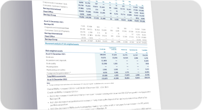 Strategic Shareholder Climate and Risk Financial Financial Barclays PLC 359 report information sustainability report Governance review review statements Annual Report 2022 Risk performance - Treasury and Capital risk (continued) Risk weighted assets Risk weighted assets (RWAs) by risk type and business Operation Total Credit risk Counterparty credit risk Market risk al risk RWAs Settlemen Std IRB Std IRB t risk CVA Std IMA As at 31 December 2022 £m £m £m £m £m £m £m £m £m £m Barclays UK 6,836 54,752 167 — — 72 233 — 11,023 73,083 Corporate and Investment Bank 35,738 75,413 16,814 21,449 80 3,093 13,716 22,497 27,064 215,864 Consumer, Cards and Payments 27,882 3,773 214 46 — 61 — 388 6,559 38,923 Barclays International 63,620 79,186 17,028 21,495 80 3,154 13,716 22,885 33,623 254,787 Head Office 2,636 6,843 — — — — — — (831) 8,648 Barclays Group 73,092 140,781 17,195 21,495 80 3,226 13,949 22,885 43,815 336,518 As at 31 December 2021 Barclays UK 7,195 53,408 426 — — 138 100 — 11,022 72,289 Corporate and Investment Bank 29,420 64,416 15,223 19,238 105 2,289 17,306 27,308 25,359 200,664 Consumer, Cards and Payments 20,770 2,749 215 18 — 21 — 57 6,391 30,221 Barclays International 50,190 67,165 15,438 19,256 105 2,310 17,306 27,365 31,750 230,885 Head Office 4,733 7,254 — — — — — — (1,025) 10,962 Barclays Group 62,118 127,827 15,864 19,256 105 2,448 17,406 27,365 41,747 314,136 Movement analysis of risk weighted assets Counterparty Credit risk credit risk Market risk Operational risk Total RWAs Risk weighted assets £m £m £m £m £m As at 31 December 2021 189,945 37,673 44,771 41,747 314,136 Book size 15,371 (3,254) (9,707) 2,068 4,478 Acquisitions and disposals (1,187) — — — (1,187) Book quality (2,236) 1,320 — — (916) Model updates — — — — — Methodology and policy 2,961 2,952 — — 5,913 a Foreign exchange movement 9,019 3,305 1,770 — 14,094 Total RWA movements 23,928 4,323 (7,937) 2,068 22,382 As at 31 December 2022 213,873 41,996 36,834 43,815 336,518 Note a Foreign exchange movements does not include impact of foreign exchange for modelled market risk or operational risk. Overall RWAs increased £22.4bn to £336.5bn (December 2021: £314.1bn) Credit risk RWAs increased £23.9bn: • A £15.4bn increase in book size primarily driven by an increase in lending activities across CIB, CC&P and growth in mortgages within Barclays UK • A £1.2bn decrease in acquisitions and disposals primarily driven by the disposal of Barclays' equity stake in Absa, offset by Gap portfolio acquisition • A £2.2bn decrease in RWAs due to book quality primarily driven by the benefit in mortgages from an increase in the HPI, partially offset by movements in risk parameters primarily within Barclays UK • A £3.0bn increase in methodology and policy primarily as a result of regulatory changes relating to implementation of IRB roadmap changes, partially offset by the reversal of the software intangibles benefit • A £9.0bn increase in FX primarily due to appreciation of USD against GBP Counterparty Credit risk RWAs increased £4.3bn: • A £3.3bn decrease in book size primarily driven by derivative mark-to-market movements • A £1.3bn increase in RWAs due to book quality primarily driven by movements in risk parameters within CIB • A £3.0bn increase in methodology and policy as a result of regulatory changes relating to the introduction of SA-CCR • A £3.3bn increase in FX primarily due to appreciation of USD against GBP Market risk RWAs decreased £7.9bn: • A £9.7bn decrease in book size primarily driven by a £6.7bn in Stressed Value at Risk (SVaR) model adjustment as a result of changes in portfolio composition, a £2.3bn decrease due to client and trading activities and a £0.7bn reduction in Structural FX • A £1.8bn increase in FX primarily due to appreciation of USD against GBP