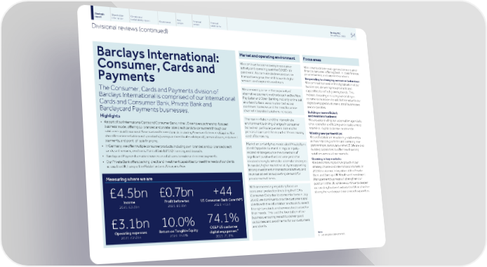 Strategic Shareholder Climate and Risk Financial Financial Barclays PLC 54 report information sustainability report Governance review review statements Annual Report 2022 Divisional reviews (continued) Market and operating environment Focus areas Barclays International: We continue to see recovery in consumer We strive to deliver next-generation consumer financial services, offering best-in-class finance, activity and spending post the COVID-19 private banking and payment solutions. pandemic. As cash use declines and online Consumer, Cards and Responding to changing consumer behaviour: transactions grow, the shift towards digital We continue to invest in the digitalisation of our services and payments continues. businesses, delivering new products and Payments capabilities to reflect growing trends. This We are seeing a rise in the popularity of includes focusing on scaling our existing e- alternative payment methods such as Buy Now The Consumer, Cards and Payments division of commerce solutions to add further value to our Pay Later and Open Banking, not only online but Barclays International is comprised of our International digitally engaged customers, small businesses also face to face, as consumer behaviour and corporates. continues to evolve and the need for omni- Cards and Consumer Bank, Private Bank and Building a more efficient channel integrated solutions increases. Barclaycard Payments businesses. and seamless business: We are accelerating our automation agenda to The rise in inflation and the interest rate Highlights drive operational efficiency and create a more environment is driving changes in consumer • As part of our International Cards and Consumer Bank, in the US we have a partnership-focused seamless, digital customer experience. behaviour, particularly around demand for business model, offering co-branded and private-label credit cards to consumers through our personal loans and the impact of the increasing Winning new partnerships: relationships with some of America’s well known brands, including American Airlines and Gap Inc. We cost of borrowing. We are focused on broadening relationships also offer online retail deposits products (savings and certificates of deposit), personal loans, instalment with our existing partners and pursuing new payments, and point-of-sale financing. Market uncertainty has moderated Private Bank partnerships, particularly in the US. We are also • In Germany, we offer multiple consumer products, including own-branded and co-branded credit clients' appetite to invest in regular equity- building capabilities to offer new financing cards, online loans, electronic Point of Sale (ePOS) financing and deposits. related strategies while the comeback of solutions across all our markets. • Barclaycard Payments enables businesses of all sizes to make and receive payments. significant positive fixed income yields has Growing in key markets: created strong tailwinds for alternate strategies. • Our Private Bank offers banking, credit and investment capabilities to meet the needs of our clients We are continuing to drive growth in our In parallel, higher market volatility is supporting across the UK, Europe, the Middle East and Africa, and Asia. strategic home and international markets. In strong investment in transactional activity and 2023 the planned integration of the Private revenue as well as supporting demand for Bank and Barclays UK Wealth and Investment Measuring where we are private market funds. Management business will strengthen our position in the UK, while we continue to deepen With an increasing regulatory focus on our existing footprint outside the UK and further consumer protection (including the FCA’s strengthen and expand our product capabilities. £4.5bn £0.7bn +44 Consumer Duty due to come into force in July Income Profit before tax US Consumer Bank Care tNPS 2023), we continue to provide customers and 2021: £3.3bn 2021: £0.8bn 2021: +43.4 clients with the information and tools to select the right products and services best suited for their needs. This is at the foundation of our business, ensuring we act to deliver good 74.1% outcomes and avoid harms for our customers £3.1bn 10.0% CC&P US customer and clients. Operating expenses Return on Tangible Equity a digital engagement 2021: £2.4bn 2021: 15.0% 2021: 71.8% Note a Excluding new Gap customers.