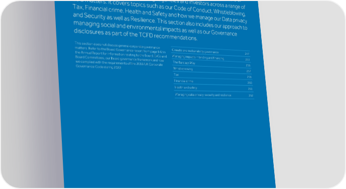 Strategic Shareholder Climate and Risk Financial Financial Barclays PLC 246 report information sustainability report Governance review review statements Annual Report 2022 Other Governance This section aims to provide an overview of certain governance matters of particular relevance to ESG ratings agencies and investors across a range of ESG matters. It covers topics such as our Code of Conduct, Whistleblowing, Tax, Financial crime, Health and Safety and how we manage our Data privacy and Security as well as Resilience. This section also includes our approach to managing social and environmental impacts as well as our Governance disclosures as part of the TCFD recommendations. This section does not discuss general corporate governance Climate and sustainability governance 247 matters. Refer to the Board Governance report from page 142 in Managing impacts in lending and financing 253 the Annual Report for information relating to the Board, ExCo and Board Committees, our Board governance framework and how The Barclays Way 256 we complied with the requirements of the 2018 UK Corporate Whistleblowing 257 Governance Code during 2022. Tax 258 Financial crime 260 Health and safety 261 Managing data privacy, security and resilience 262
