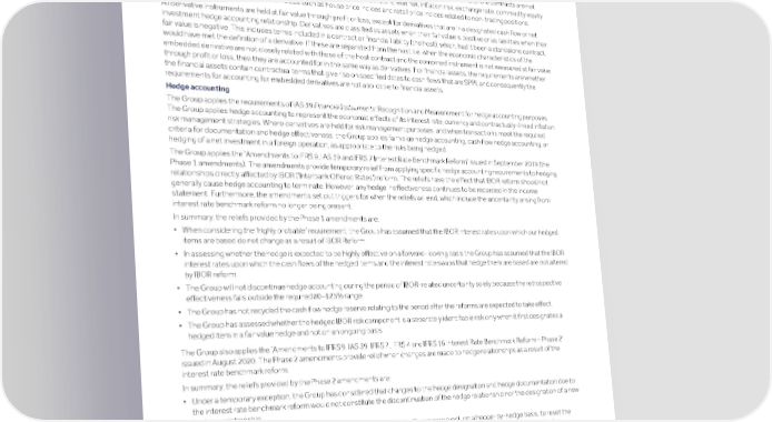 Strategic Shareholder Climate and Risk Financial Financial Barclays PLC 447 report information sustainability report Governance review review statements Annual Report 2022 Notes to the financial statements (continued) Assets and liabilities held at fair value 14 Derivative financial instruments Accounting for derivatives Derivative instruments are contracts whose value is derived from one or more underlying financial instruments or indices defined in the contract. They include swaps, forward-rate agreements, futures, options and combinations of these instruments and primarily affect the Group’s net interest income, net trading income and derivative assets and liabilities. Notional amounts of the contracts are not recorded on the balance sheet. Derivatives are used to hedge interest rate, credit risk, inflation risk, exchange rate, commodity equity exposures, and exposures to certain indices such as house price indices and retail price indices related to non-trading positions. All derivative instruments are held at fair value through profit or loss, except for derivatives that are in a designated cash flow or net investment hedge accounting relationship. Derivatives are classified as assets when their fair value is positive or as liabilities when their fair value is negative. This includes terms included in a contract or financial liability (the host), which, had it been a standalone contract, would have met the definition of a derivative. If these are separated from the host, i.e. when the economic characteristics of the embedded derivative are not closely related with those of the host contract and the combined instrument is not measured at fair value through profit or loss, then they are accounted for in the same way as derivatives. For financial assets, the requirements are whether the financial assets contain contractual terms that give rise on specified dates to cash flows that are SPPI, and consequently the requirements for accounting for embedded derivatives are not applicable to financial assets. Hedge accounting The Group applies the requirements of IAS 39 Financial Instruments: Recognition and Measurement for hedge accounting purposes. The Group applies hedge accounting to represent the economic effects of its interest rate, currency and contractually-linked inflation risk management strategies. Where derivatives are held for risk management purposes, and when transactions meet the required criteria for documentation and hedge effectiveness, the Group applies fair value hedge accounting, cash flow hedge accounting, or hedging of a net investment in a foreign operation, as appropriate to the risks being hedged. The Group applies the ‘Amendments to IFRS 9, IAS 39 and IFRS 7 Interest Rate Benchmark Reform’ issued in September 2019 (the Phase 1 amendments). The amendments provide temporary relief from applying specific hedge accounting requirements to hedging relationships directly affected by IBOR (‘Interbank Offered Rates’) reform. The reliefs have the effect that IBOR reform should not generally cause hedge accounting to terminate. However, any hedge ineffectiveness continues to be recorded in the income statement. Furthermore, the amendments set out triggers for when the reliefs will end, which include the uncertainty arising from interest rate benchmark reform no longer being present. In summary, the reliefs provided by the Phase 1 amendments are: ▪ When considering the ‘highly probable’ requirement, the Group has assumed that the IBOR interest rates upon which our hedged items are based do not change as a result of IBOR Reform. ▪ In assessing whether the hedge is expected to be highly effective on a forward-looking basis the Group has assumed that the IBOR interest rates upon which the cash flows of the hedged items and the interest rate swaps that hedge them are based are not altered by IBOR reform. ▪ The Group will not discontinue hedge accounting during the period of IBOR-related uncertainty solely because the retrospective effectiveness falls outside the required 80–125% range. ▪ The Group has not recycled the cash flow hedge reserve relating to the period after the reforms are expected to take effect. ▪ The Group has assessed whether the hedged IBOR risk component is a separately identifiable risk only when it first designates a hedged item in a fair value hedge and not on an ongoing basis. The Group also applies the ‘Amendments to IFRS 9, IAS 39, IFRS 7, IFRS 4 and IFRS 16 Interest Rate Benchmark Reform – Phase 2’ issued in August 2020. The Phase 2 amendments provide relief when changes are made to hedge relationships as a result of the interest rate benchmark reform. In summary, the reliefs provided by the Phase 2 amendments are: ▪ Under a temporary exception, the Group has considered that changes to the hedge designation and hedge documentation due to the interest rate benchmark reform would not constitute the discontinuation of the hedge relationship nor the designation of a new hedging relationship. ▪ In respect of the retrospective hedge effectiveness assessment, the Group may elect, on a hedge-by-hedge basis, to reset the cumulative fair value changes to zero when the exception to the retrospective assessment ends (Phase 1 relief). Any hedge ineffectiveness will continue to be measured and recognised in full in profit or loss. ▪ The Group has deemed the amounts accumulated in the cash flow hedge reserve to be based on the alternative benchmark rate (on which the hedge future cash flows are determined) when there is a change in basis for determining the contractual cash flows. ▪ For hedges of groups of items (such as those forming part of a macro cash flow hedging strategy), the amendments provide relief for items within a designated group of items that are amended for changes directly required by the reform. ▪ In respect of whether a risk component of a hedged item is separately identifiable, the amendments provide tempora